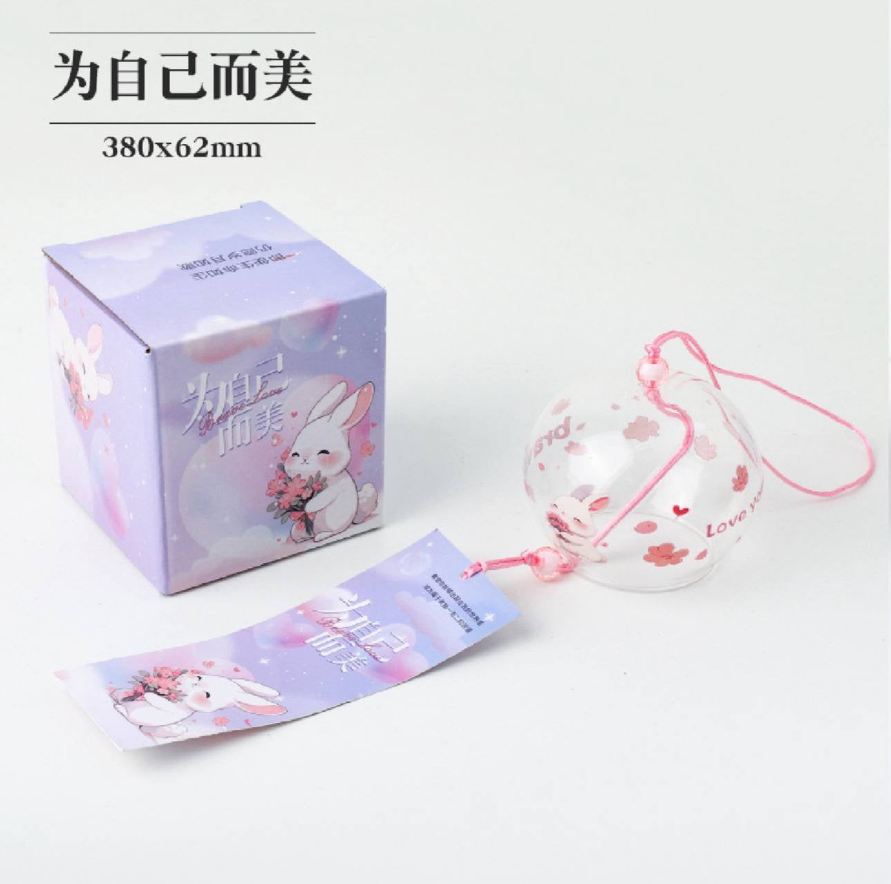 • الرسم: الجرس الزجاجي الشفاف مزين برسومات أرنب صغير وأزهار الكرز الوردية، ومكتوب عليه عبارة "Love you".
