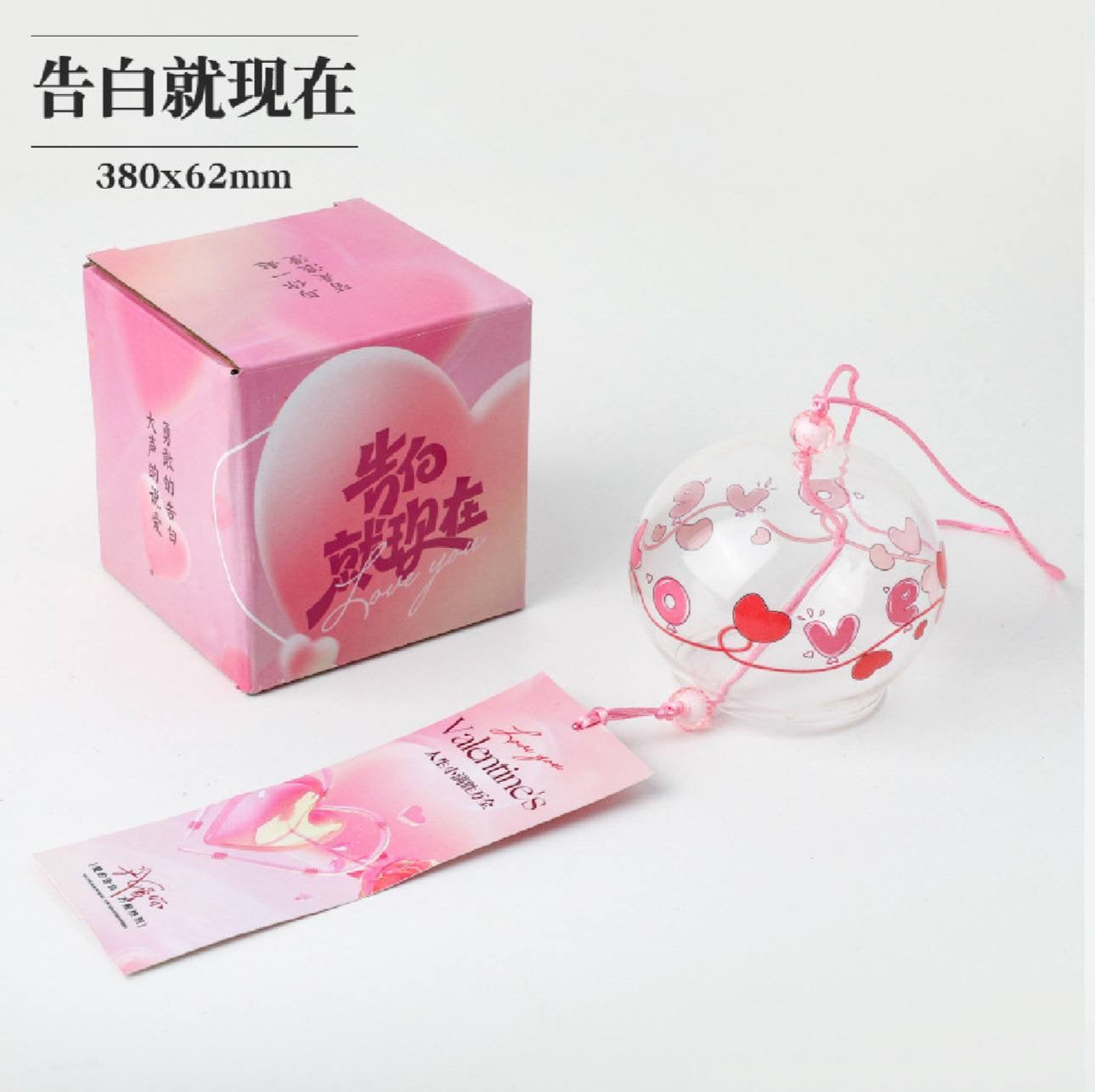 • الجرس: جرس زجاجي شفاف مزين برسومات قلوب حمراء ووردية رقيقة، مع كلمة "LOVE" موزعة بشكل فني.