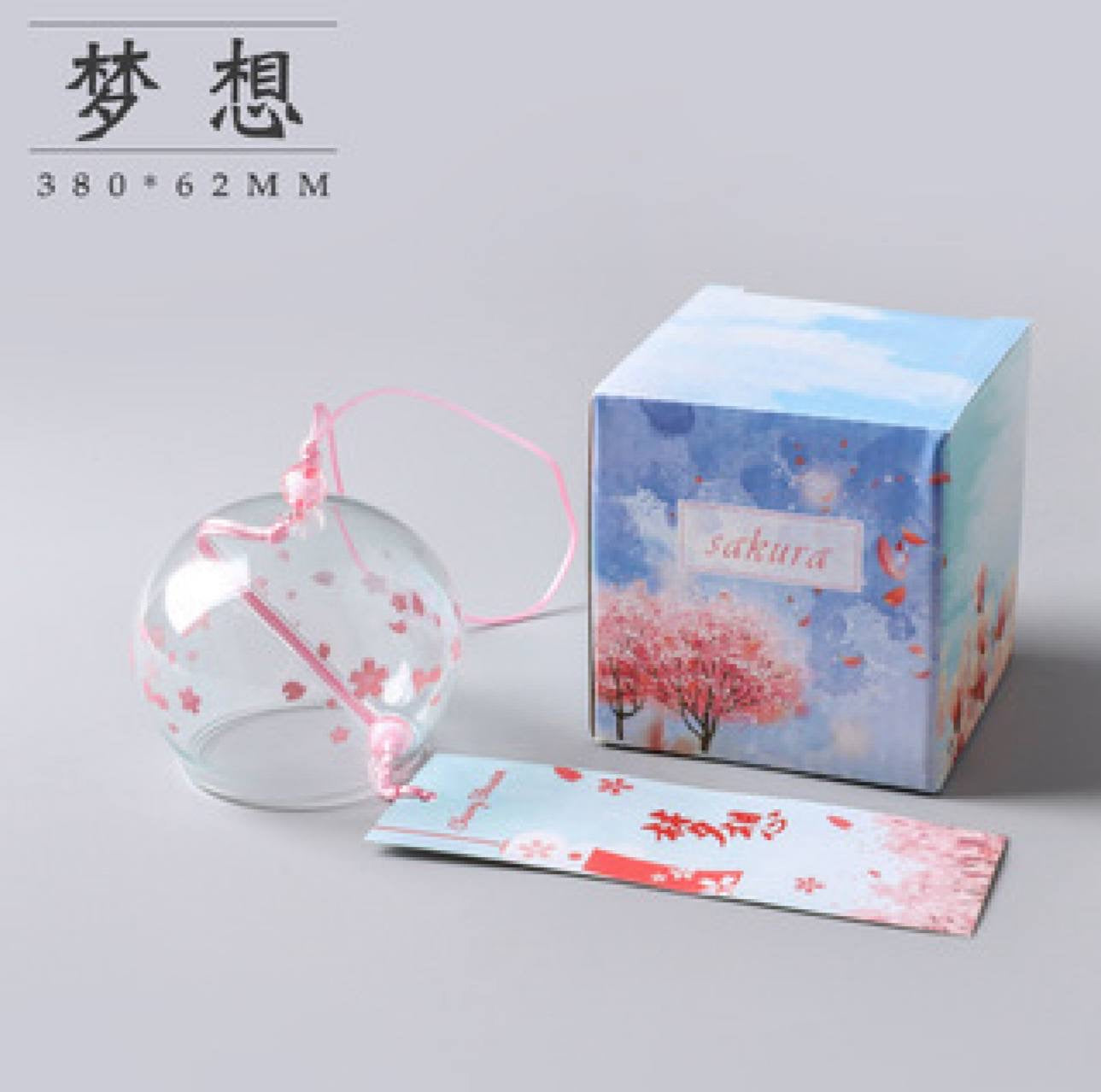• الوصف: جرس شفاف مزين ببتلات الساكورا الوردية الرقيقة، ويأتي مع بطاقة ورقية (تنزوكو) تحمل نقوشاً متطابقة لتتحرك مع النسيم.